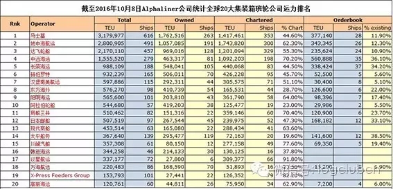 Alphaliner于2016年10月8日發(fā)布最新集裝箱班輪公司排名,全球班輪公司運力100強中排名前三的分別是馬士基航運、地中海航運和達飛輪船,運力共占據全球運力的39.2%。而韓進(jìn)海運由9月1日的第7名跌落至第16名,運力份額降至1.7%。全球前20大集裝箱班輪公司運力排名如上圖。